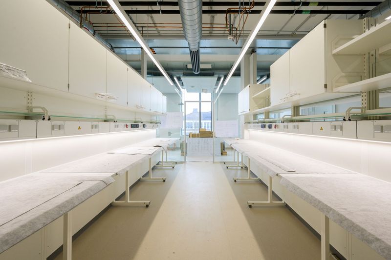 Das Gebäude ist in zweigeteilt: Oben finden sich Cluster aus Büroräumen und Laboren mit Nebenräumen. Im Untergeschoss ist neben den Medienzentralen auch die Bildgebungszentrale verortet.