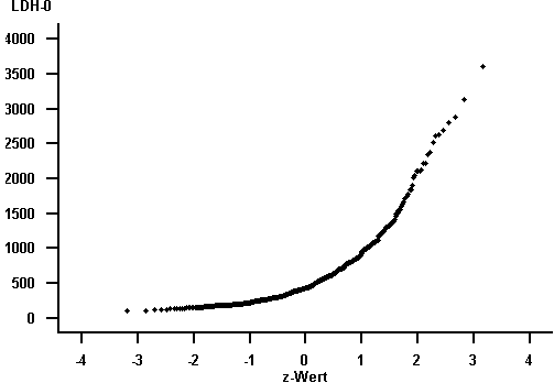 Die empirische Verteilungsfunktion zeigt für das "LDH" ebenfalls nicht die für die Normalverteilung typische sigmoide Form. Beim "log(LDH)" ist diese Form zu sehen.