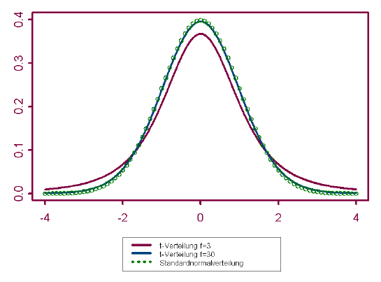 bestimmen lässt. Der Graph von f ähnelt dem der Dichte der Standardnormalverteilung. f hat sein Maximum bei t=0 und nähert sich symmetrisch zur y-Achse asymptotisch der t-Achse. Die Form der Verteilung hängt noch vom Umfang n der Stichprobe ab, aus der die empirische Standardabweichung berechnet wurde. Je größer n ist, desto mehr nähert sich die t-Verteilung der Standardnormalverteilung an.