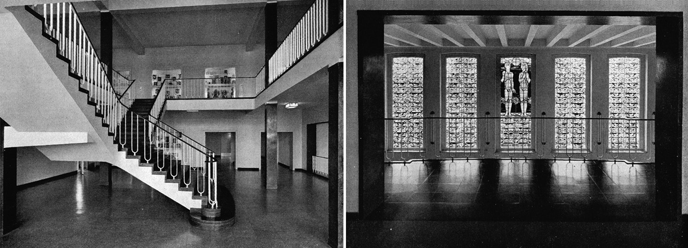 "...Die fünf hohen Fenster der Eingangshalle zeigen eine künstlerische Ausgestaltung durch farbige Bleiverglasung. Das Motiv der Glasbilder behandelt in symbolischen und figürlichen Darstellungen das Thema „Vom Unbelebten zum Lebendigen". Es wurde nach Anregungen des Institutsdirektors von Prof. Vinzenz Pieper (Technische Universität Berlin) entworfen und von der Firma Junglas, Münster, ausgeführt..."