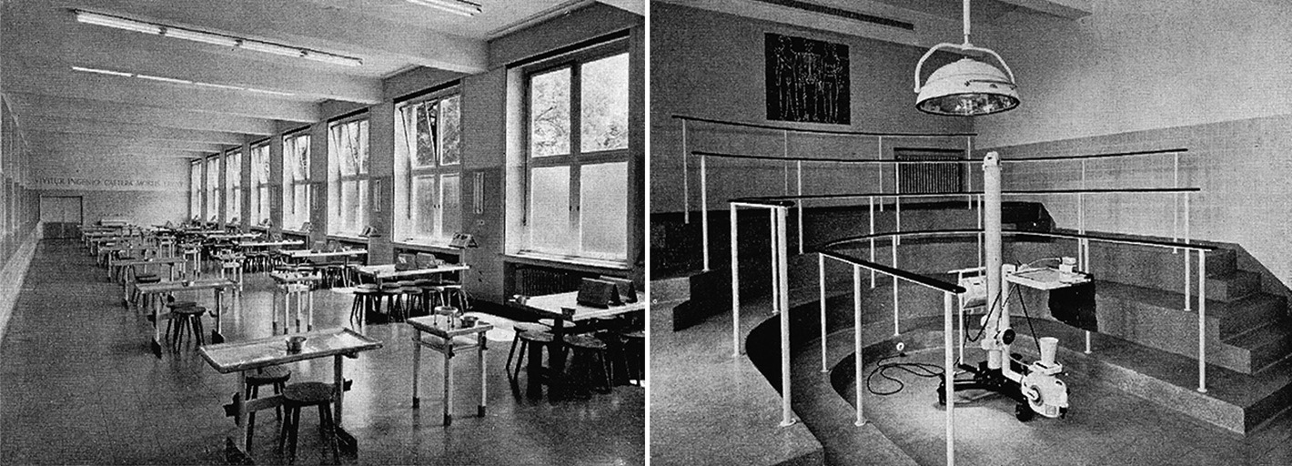 "...Nach Überwindung der zweiarmigen Treppe in der Eingangshalle erreicht man den unteren Demonstrationsraum, von dem man in gerader Richtung zur Kleiderablage unter dem Hörsaalgestühl- und rechtsseitig in die anatomische Sammlung über den Seziersälen gelangt. Von dem unteren Demonstrationsraum im ersten Obergeschoß führt die Haupttreppe weiter durch den Demonstrationsraum im zweiten Obergeschoß zum großen und kleinen Hörsaal. Dem großen Hörsaal schließen sich ein Vorbereitungsraum sowie die Unterrichtsräume zur Ausbildung von medizinisch-technischen Assistentinnen an..."