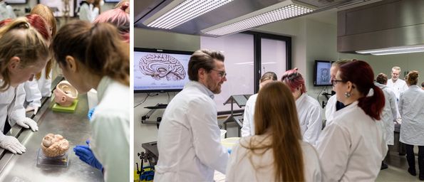 Für das erste Semester der Masterstudiengangs Kognitive Neurowissenschaften (iKoN), der zusammen mit dem Fachbereich Psychologie und Sportwissenschaften eingerichtet ist, wird im Wintersemester ein Seminar und ein praktischer Kurs Neuroanatomie angeboten. In diesem Kurs werden die Strukturen des menschlichen Gehirns an Spendergehirnen, Modellen, histologischen Präparaten und Exponaten der Anatomischen Sammlung erarbeitet. Intensiv werden dabei auch funktionelle Systeme betrachtet, z.B. die Sinnessysteme oder die Bereiche, die in das Verstehen oder Produzieren von Sprache involviert sind. Das Wissen um funktionelle Zusammenhänge der anatomisch beschriebenen Strukturen und die Verbindung theoretischer und praktischer Arbeit soll den Studierenden ein vertieftes Verständnis der komplexen Strukturen des menschlichen Gehirns ermöglichen.