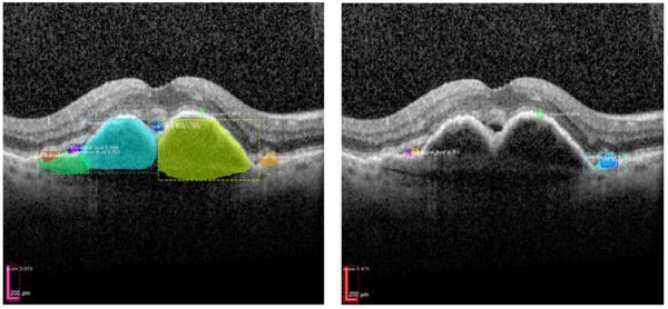 Wir konnten im Rahmen unserer Kooperation mit Prof. Malcherek vom Fachbereich Informatik der Hochschule Darmstadt Deep-Learning-Algorithmen entwickeln, die präzise zwischen aktiver und inaktiver neovaskulärer AMD unterscheiden können. In einem weiteren Projekt wurde ein Deep-Learning-Algorithmus auf das automatische Erkennen verschiedener AMD-typischer Veränderungen auf den OCT-Bildern trainiert. Ein weiterer Schwerpunkt bildet die automatische Erkennung von glaukomatös veränderten Sehnerven bei Glaukompatient:innen. Ein entsprechend mittels Fundusfotografien geschulter Algorithmus erreichte eine gute Trennschärfe zwischen Sehnerven mit glaukomatösem Schaden und solchen, bei denen zwar auffällige Veränderungen, aber kein Nervenfaserschichtverlust bestand. Hier erreichte der Algorithmus bei Hinzuziehen von weiteren Metadaten ein ähnlich gutes Ergebnis wie ein Glaukomspezialist. Weitere Projekte zur Etablierung von Methoden zur Bildannotation sind in Vorbereitung.