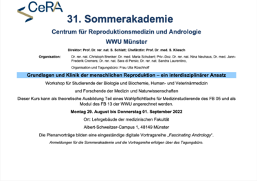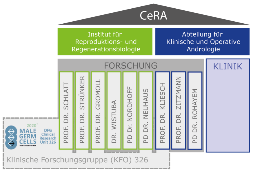 Das Centrum für Reproduktionsmedizin und Andrologie (CeRA) ist spezialisiert auf die Erforschung der Reproduktionsfunktion und die klinische Behandlung von Männern. Unsere Forschung sowie die translationalen und klinischen Studien am CeRA helfen, neue Erkenntnisse zu den Fortpflanzungsfunktionen zu generieren und Patienteninnen und Patienten eine optimale, auf den aktuellsten Forschungsergebnissen basierende Therapie zu gewähren. Forschende sowie Ärztinnen und Ärzte vereinen bei uns ihr multidisziplinäres Fachwissen aus den Gebieten der Reproduktionsmedizin und -biologie, Physik, Chemie, Physiologie, Gynäkologie, Andrologie, Humangenetik, und Stammzellforschung untersuchen gemeinsam in multidisziplinären Projektteams die grundlegenden Prinzipien der Befruchtung.
