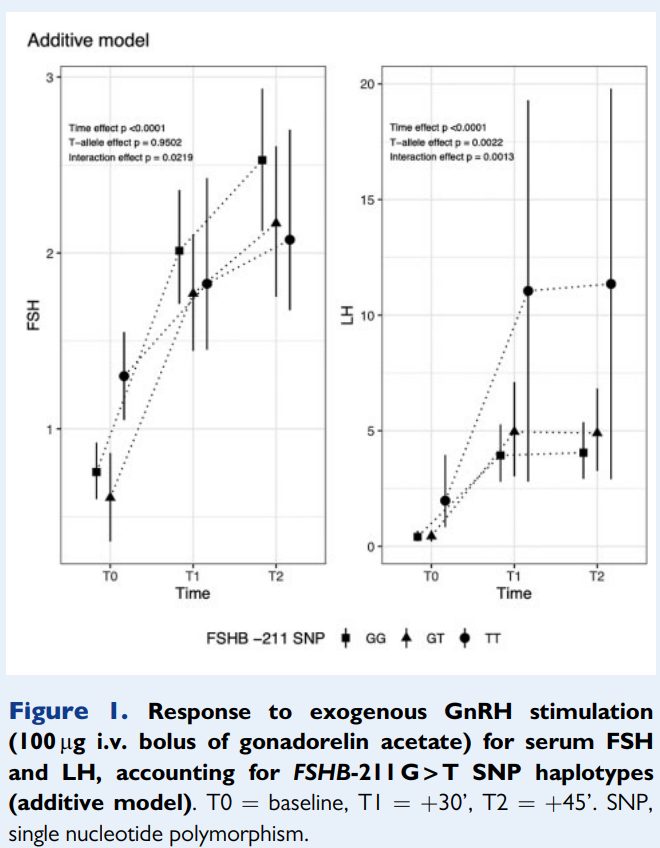 We therefore perform stimulation tests by administering an i.v. bolus of 100 mg of a synthetic LHRH-analogue and then measure FSH and LH levels at different time points. An retrospective analysis using genetic and clinical data from our database enables us to investigate any potential FSHB-211 SNPs affect on FSH levels following GnRH stimulation.