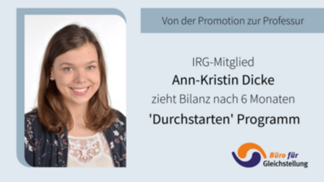 IRG-Doktorandin Ann-Kristin Dicke zählt zu der ersten Kohorte von Promovendinnen, die das Karriereförderprogramm „Durchstarten“ durchlaufen. Das Programm wird vom Gleichstellungsbüro der Universität Münster durchgeführt. Sechs Monate nach dem Startschuss zieht Ann-Kristin im Gespräch mit IRG-Projektmanagerin Hannah Lorenz eine Zwischenbilanz. Konkret sprechen sie über die Inhalte des Programms, die Leaky Pipeline und inspirierende Brown Bag Lunches. Im kommenden Wintersemester wird es eine Neuauflage von „Durchstarten“ geben. Bewerbungen sind ab Ende April möglich. Mehr Informationen gibt es auf der Homepage des Gleichstellungsbüros.