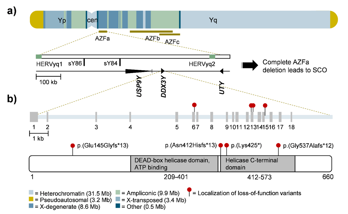 Die Geschlechtschromosomen (X und Y) sind für die Fruchtbarkeit des Mannes von entscheidender Bedeutung, da sie mehrere Gene enthalten, die für die Geschlechtsbestimmung und die Fortpflanzungsfunktion wesentlich sind. Die geschlechtschromosomalen keimzellenspezifischen Gene sind für die Erforschung der männlichen Unfruchtbarkeit besonders interessant, da pathogene Varianten in diesen Genen bei Männern im Gegensatz zu autosomal rezessiven Mutationen nicht durch ein normales Allel maskiert werden können. Auf dem menschlichen Y-Chromosom sind die Gene in den AZF-Regionen, neben dem Geschlechtsbestimmungsfaktor SRY, nachweislich für eine ordnungsgemäße Spermatogenese unerlässlich. Die krankheitsverursachenden Gene innerhalb dieser Regionen sind jedoch nach wie vor unklar. Durch das Screening der Exom-Sequenzierungsdaten der MERGE-Kohorte auf seltene genetische Varianten in Genen mit hodenspezifischer Expression wollen wir neue geschlechtschromosomale Gene identifizieren, die mit der Krankheit in Verbindung stehen. Als erstes Ergebnis konnten wir nachweisen, dass das Gen DDX3Y der wichtigste spermatogene Faktor innerhalb der Y-chromosomalen AZFa-Region ist.