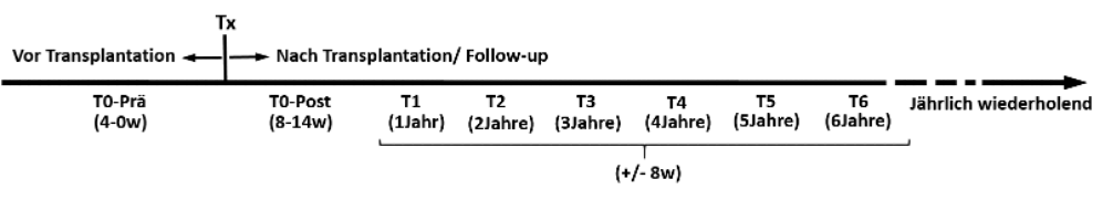 Durch die Teilnahme am Register entstehen Ihnen keine zusätzlichen Untersuchungstermine im Transplantationszentrum/-Klinik. Zu den normalen Vor- und Nachsorgeuntersuchungszeiträumen zur Lebendspende würde Ihnen bei Teilnahme am Register ein Fragebogen überreicht werden, den Sie z.B. in Ihrer Wartezeit zu Ihrem Termin ausfüllen können. Damit Sie dennoch eine Vorstellung haben, zu welchen Messzeitpunkten Daten erhoben werden, sind diese in der unteren Abbildung dargestellt worden.