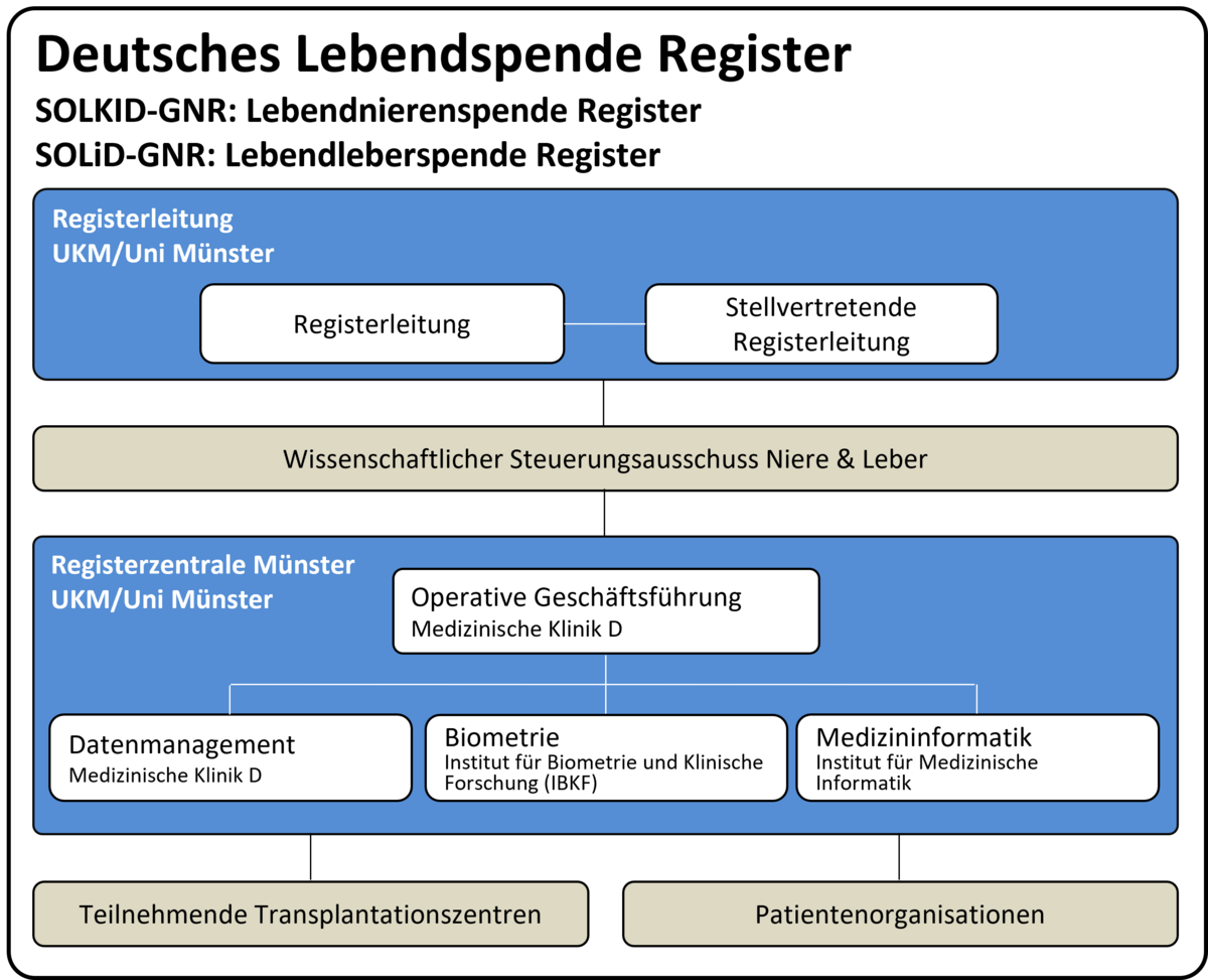 Die Registerzentrale des Deutschen Lebendspende Registers ist an der medizinischen Fakultät der Universität Münster lokalisiert. Die Registerzentrale besteht aus dem Projektmanagement (Medizinischen Klinik D), dem Datenmanagement (Medizinischen Klinik D), der Medizininformatik (Institut für Medizinische Informatik) und der Biometrie (Institut für Biometrie und Klinische Forschung (IBKF)).