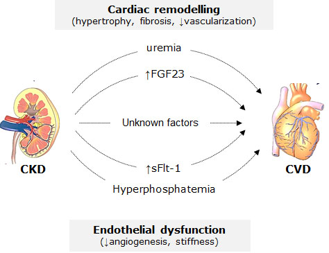 Chronic kidney disease (CKD) is a worldwide public health problem and a risk factor for cardiovascular disease (CVD). Structural cardiovascular damage that is paralleled by functional changes has been shown in response to CKD in patients and animal models. Cardiac remodelling that occurs in CKD is mainly characterized by three aspects including hypertrophy, decreased vascularization/microvascular dysfunction, and interstitial fibrosis.