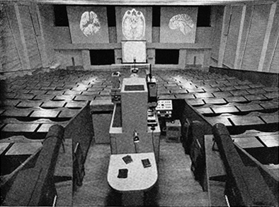 "...Der große Hörsaal umfasst 420 Plätze und bietet alle Projektionsmöglichkeiten. Auf der östlichen Fensterseite des Hörsaales ist ein Verbindungsgang neben dem Gestühl für den Transport von Sammlungsgegenständen zum Vortragstisch freigelassen. Das Gestühl steigt gleichmäßig in leicht geschwungenen Stufen an. Der kleine Hörsaal mit Projektionseinrichtung bietet Raum für 120 Plätze. Im Mikroskopiersaal, der 250 Plätze enthält, arbeiten die Studierenden in Gruppen zu vieren an einem Tisch, der in der Mitte eine Mikroskopierlampe trägt. Von dem Leichenkeller führt ein Lastenaufzug zu den Sezierräumen und der darüber liegenden Sammlung, an die sich die Arbeitsräume des Präparators und eine offene Knochenbleiche anschließen..."