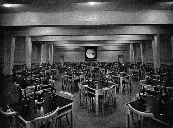 "...Bei dem Brande des früheren Institutes waren die Schränke der Anatomischen Sammlung gerettet worden. Sie haben nach einer Umarbeitung im neuen Institut Verwendung gefunden und sind durch einige weitere Schauschränke und Vitrinen vervollständigt. Alle Schränke sind von innen zu erleuchten. Die Sammlung steht den Studierenden offen und bietet an 18 Arbeitstischen, die an den Längswänden zwischen den Fenstern aufgestellt und für mikroskopische Zwecke beleuchtbar sind, Gelegenheit zum Studium. Hinter der Sammlung befinden sich die Arbeitsräume des Präparators..."