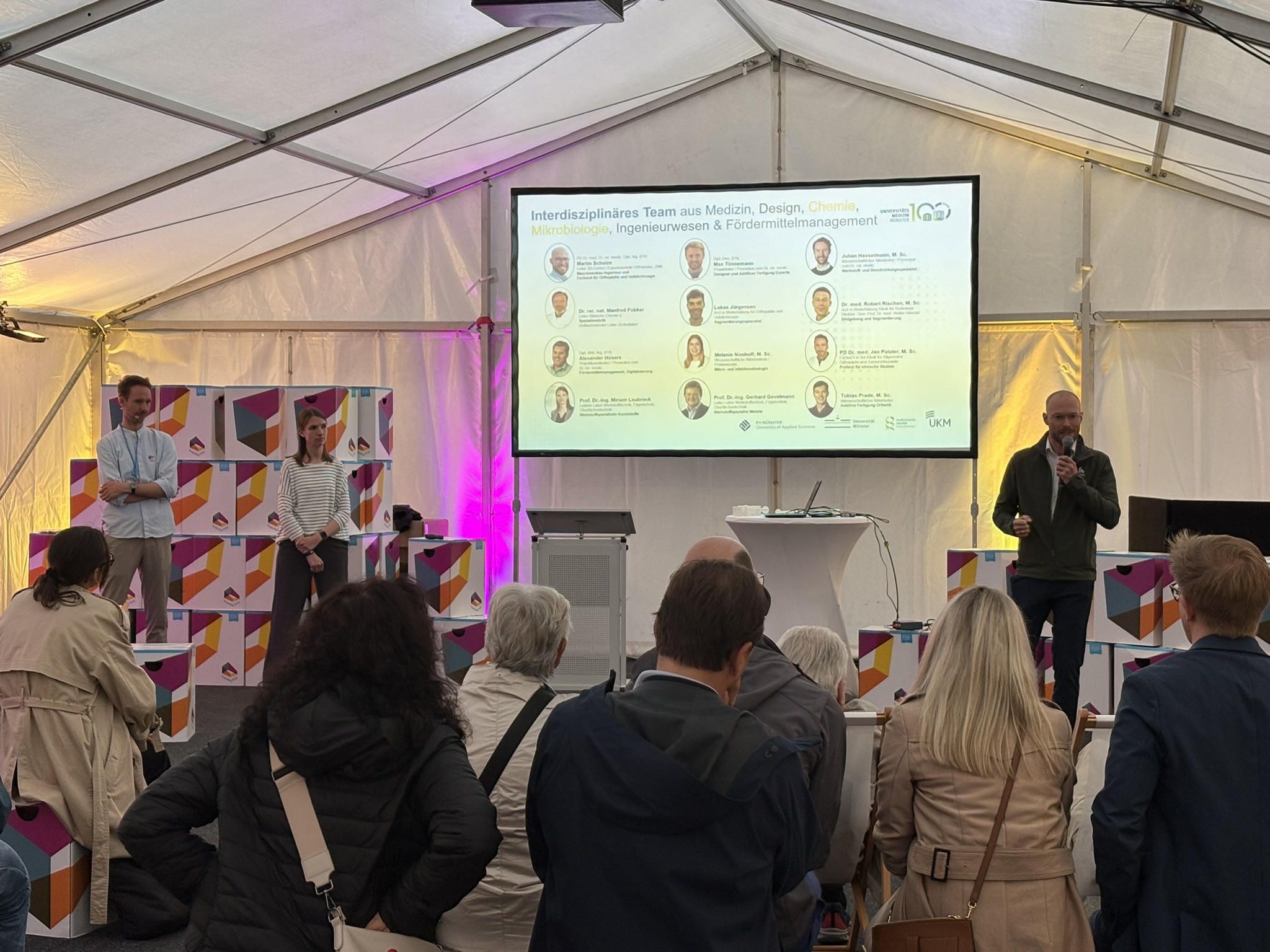 The highlight was the evening lecture "Limitless health? How prevention and therapy benefit from digital transformation and 3D printing", which was given by PD Dr. Dr. Martin Schulze and Julian Hasselmann from our team together with Prof. Dr. Miriam Laubrock from Münster University of Applied Sciences. The interdisciplinary presentation illustrated how the close collaboration between engineering and medicine opens up new avenues for personalized, efficient and future-oriented healthcare. The SchlauRaum Festival, a joint event organized by Münster Marketing, the University of Münster, Münster University of Applied Sciences and the UKM, thus provided an ideal platform to present the innovative research work of the 3D-Lab to a broad public.