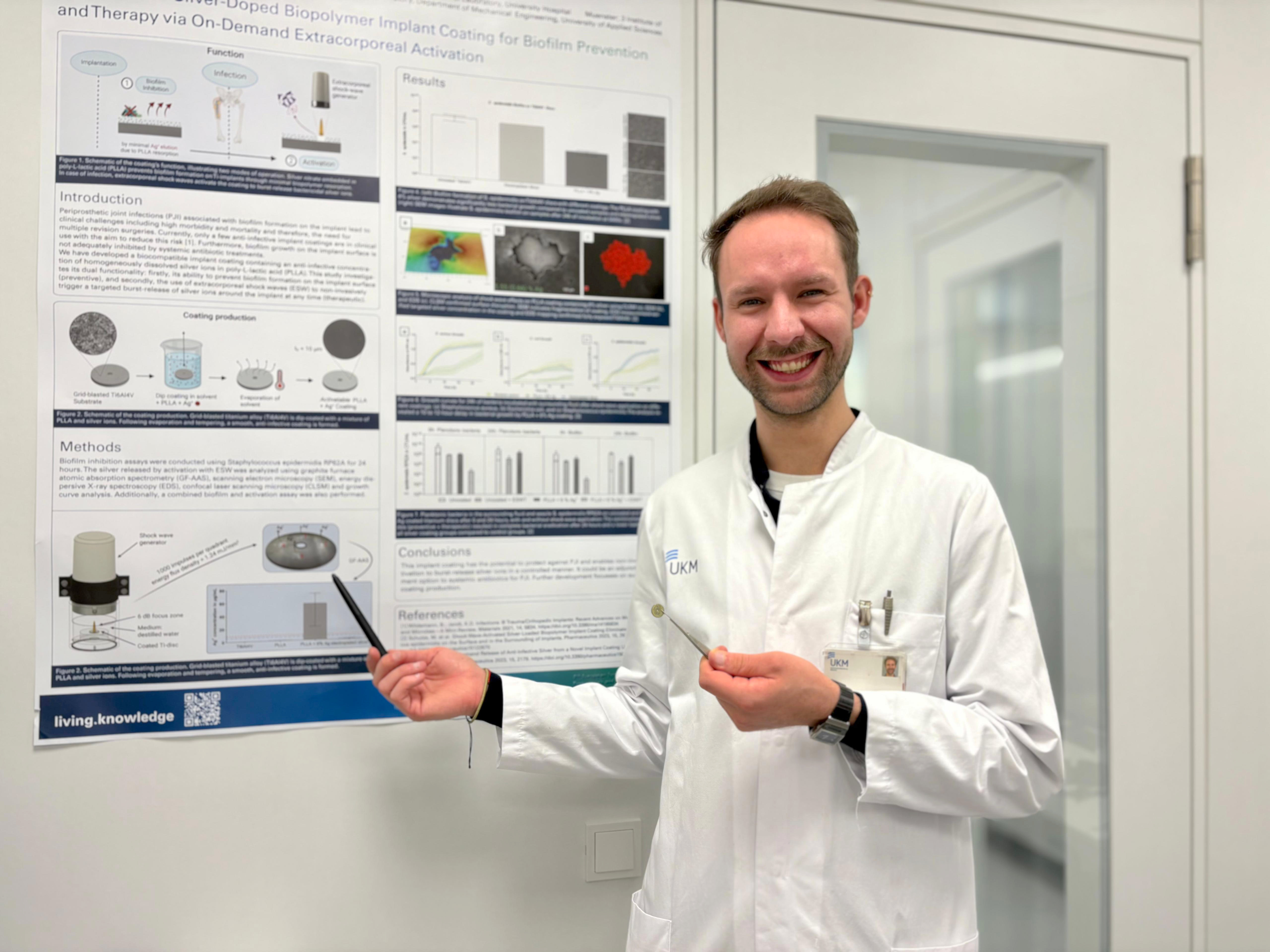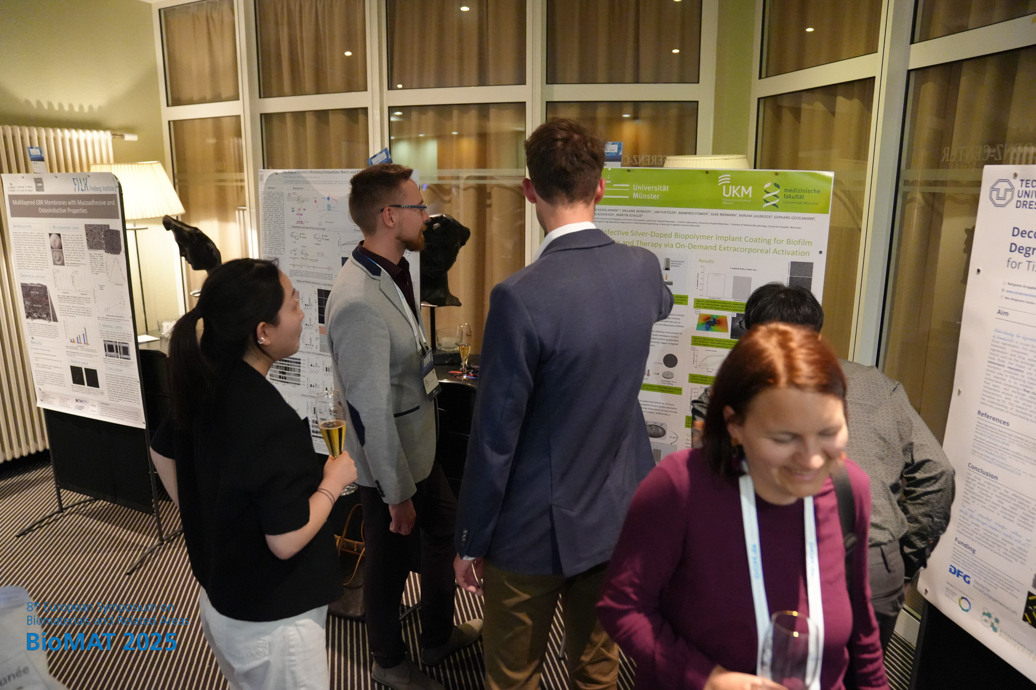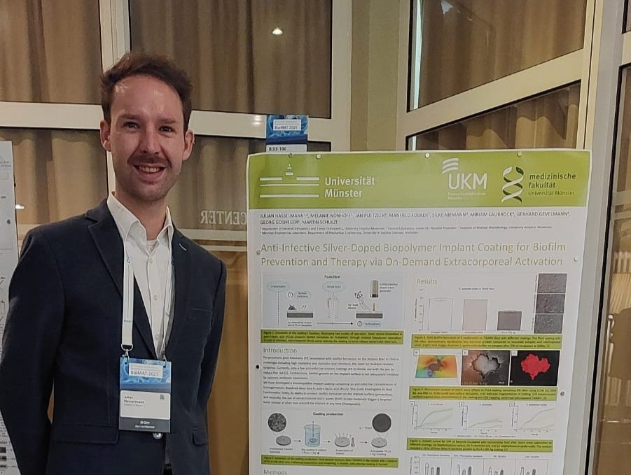 In his poster presentation, Hasselmann demonstrated that our implant coating effectively protects against bacterial colonization and can treat existing infections through extracorporeal shock wave activation. The preclinical results demonstrate a significant reduction in biofilm formation and complete bacterial eradication within 24 hours of activation. Participating in BioMAT 2025 provided an excellent opportunity to exchange ideas with the expert panel and discuss future applications of our technology.