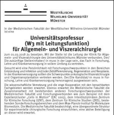 News aus dem Jahr 2016 1/5/2016Kräftemessen diesmal außerhalb des Landtags: Für Thomas Marquardt ist die NAKO-Teilnahme „Ehrensache“ 1/8/2016400 Gäste beim WWU-Neujahrsempfang: Zwei Universitätspreise gehen in die Medizin 1/9/2016Einblicke in das (vermeintliche) Reich von Boerne und Thiel: Alumni-Verein MedAlum besichtigte Institut für Pathologie 1/11/2016Modernisierungskurs der münsterschen Universitätsmedizin in vollem Gange: Neujahrsempfang von UKM und Medizinischer Fakultät im Stadttheater 1/13/2016Beethoven bereichert die Nationalen Kohorte: Münstersche Künstlerin zeigt Auswahl ihrer Werke im Studienzentrum 1/14/2016Erfolg für die münstersche Reproduktionsbiologie: DFG fördert mit 1,15 Mio. Euro drei neue Projekte des MPI und des CeRA 1/19/2016Millionenförderung für münsterschen Biochemiker: Mario Schelhaas erhält Consolidator Grant des Europäischen Forschungsrates 1/21/2016Gerhard-Domagk-Preis verliehen: Stiftung zeichnet Dr. Thomas Grünewald für Arbeit zum Ewing-Sarkom aus 1/23/2016Elf aus 159: Gewinner des Ideenwettbewerbes StipVisite 2015 stehen fest 1/27/2016Mit vereintem Fachwissen gegen den Krebs: Uni-Frauenklinik ist Mitinitiator des EU-Projektes GLYCANC 1/29/2016Mark Wetterkamp erhält Posterpreis bei Wirbelsäulenkongress 1/30/2016Dank an 85 Förderer – darunter auch MedAlum: "ProTalent" verleiht Zertifikate bei Stipendienfeier 2/1/2016Neue Behandlungskonzepte: UKM-Orthopädie lädt ein zum „8. Münsteraner Frühjahrssymposium“ 2/2/2016Studie zu den Ursachen der Fibromyalgie: Gesunde Kontrollprobandinnen gesucht 2/3/2016Medizinische Fakultät wählt Prof. Mathias Herrmann zum Dekan: Prof. Wilhelm Schmitz gibt Amt zum Jahresende ab 2/6/2016„Die Sympathie der Deutschen werde ich nie vergessen“: Syrer aus Aleppo studiert Medizin an der Universität Münster 2/12/2016Weltweit gefragte Pathologin in Münster geehrt: Prof. Renu Virmani erhält diesjährigen Preis der Stiftung Herzzentrum Münster 2/14/2016Münsterscher Universitätsmediziner Prof. Günter Breithardt für sein Lebenswerk ausgezeichnet 2/16/2016Wenn Zellen die Luft ausgeht, geht ein Licht an: Münstersche Forscher entwickeln Methode, um akuten Sauerstoffmangel in Zellen anzuzeigen 2/17/2016Kleine Gefäße mit großer Wirkung: Münstersche Biochemikerin bringt Expertise der Grundlagenforschung in neues EU-Projekt ein 2/18/2016„Distinguished Pioneer“: Nuklermediziner Schober von der OGNMB als Vordenker geehrt 2/20/2016Warum das Gehirn doch nicht gefaltet ist wie ein zerknülltes Blatt Papier: WWU-Forscher widerspricht weltweit diskutierter Theorie 2/23/2016NRW-Pathologen vernetzen sich für noch bessere Tumorbekämpfung: Verein fördert Sarkom-Forschungsverbund mit 100.000 Euro 2/26/2016Im Amt bestätigt: Prof. Heinz Wiendl weiterhin außerordentliches Mitglied der Arzneimittelkommission der Deutschen Ärzteschaft 2/29/2016Mehrere Preise, meistzitierter Artikel: Reproduktionsmedizin der Universität Münster im Aufwind 3/1/2016Mit "Trojanischen Pferden" gegen Mikroorganismen: Zuckermoleküle als Behandlungsansatz gegen lokale Infektionen 3/2/2016Erst als Zeitvertreib, dann für immer: Dr. Astrid Knirsch lebt Down Under – und schickte ihre ganze Familie zum Medizinstudium nach Münster 3/4/20161,1 Millionen Euro für interdisziplinäre Forschung: Exzellenzcluster "Cells in Motion" fördert zwölf neue Projekte 3/6/2016Pro-Scientia-Preis 2016: Münstersche Forschergruppe für Entschlüsselung der Spontanblutung bei Thrombozytenmangel ausgezeichnet 3/7/2016Heuschnupfen: Uni-Hautklinik sucht Teilnehmer für Studie zu neuer Form der Immuntherapie 3/8/2016Das leidige zweite X-Chromosom: Internationales Experten-Treffen in Münster befasst sich mit dem Klinefelter-Syndrom 3/10/2016Neue IZKF-Antragsphase: Ausschreibung für Projektskizzen 3/12/2016Wahlen im Wissenschaftsrat: Prof. Hans-Christian Pape bis 2017 neuer Vorsitzender der Wissenschaftlichen Kommission 3/14/2016Teilnahme auch aus Nutzersicht „unbedingt empfehlenswert“: Mediziner-Kolleg startet neue Kohorte 3/18/2016Ausschreibung IMF-Forschungsförderung zum 1. April 2016 3/19/2016Zwanzigfach sensibler als die Vorgänger: Neues Massenspektrometer optimiert die Analysen im Protein-Analyse-Labor des IZKF 3/25/2016Gendefekt kann Mangan-Mangel verursachen: Fachpreise für münstersche Stoffwechselforscher 3/29/2016Gefürchteter Krankenhauskeim: Wissenschaftler aus Münster und Nottingham entschlüsseln wichtiges Enzym des Bakteriums Pseudomonas aeruginosa 3/31/2016HYPMED: Münsters Pathologie an neuem Brustkrebs-Forschungsprojekt beteiligt 4/12/2016Mediziner für die Wissenschaft: Masterstudiengang "Experimentelle Medizin" ist akkreditiert 4/13/2016Frischer Wind für alte Nischen: Forscher von MPI und WWU zeigen, wie sich blutbildende Stammzellen vermehren lassen 4/14/2016Brustkrebs-Früherkennung durch Screening: Häufiger aggressive Tumorvorstufen bei Älteren 4/15/2016Der Übeltäter heißt CD-8: Münstersche Neuroimmunologen publizieren neue Erkenntnisse zu den Ursachen der Rasmussen-Enzephalitis 4/17/2016Dreiecke als Ideengeber: Japanische und deutsche Mediziner kooperieren in der Schizophrenie-Forschung 4/19/2016Mit dem zweiten sieht man besser: DFG fördert Optimierung der Laser-Massenspektrometrie an der Uni Münster 4/20/2016Weltweiter Tag des Lärms am 27. April: In Münster entwickeln Mediziner eine App für Tinnitus-Geplagte 4/22/2016Entzündlichen Muskelerkrankungen auf der Spur: Neurologe Tobias Ruck erhält Forschungspreis der DGM 4/25/2016Wissenschaftspreis für münsterschen Nuklearmediziner: Dr. Kambiz Rahbar forscht für individuellere Diagnostik bei Prostatakrebs 4/28/2016Einblicke in „Innere Welten“ – CIM-Ausstellung gastiert im Lehrgebäude der Medizinischen Fakultät 5/1/2016Diagnose „Taubenvirus“: Dr. Klaus Giesbert ist als Züchter so erfolgreich wie als Augenarzt 5/5/2016Neue Erkenntnisse zur Behandlung von Prostatakrebs: Dr. Julie Steinestel erhält Paul-Mellin-Gedächtnispreis 5/7/2016Sta