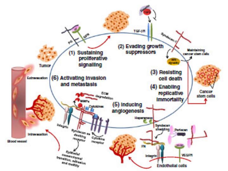 Cancer is a leading cause of mortality within the aging European population. Therapeutic targeting is hampered by the complexity of the disease, which includes not only molecular changes within the tumor cell itself, but also within its microenvironment. Tumor angiogenesis, tumor-stroma interactions, interactions with immune cells, with the extracellular matrix and cancer stem cell niches allow for malignant cell survival and promote metastasis, the leading cause for cancer-associated mortality. Proteoglycans (PGs) and glycosaminoglycans (GAGs) – structurally diverse carbohydrates of the extracellular matrix and cell surfaces - have emerged as novel biomarkers and molecular players both within tumor cells and their microenvironment, as they integrate signals from growth factors, chemokines and integrins, and cell-cell as well as matrix adhesion. Importantly, their expression is dysregulated in numerous tumor entities, and has been shown to modulate each of the hallmarks of cancer as defined by Hanahan and Weinberg (Cell 2011). We hypothesize that dysregulated function of PGs and GAGs simultaneously affects all molecular steps towards cancer metastasis as a general principle applicable to multiple tumor entities. Pharmacological modulation of their function thus emerges as an attractive multitargeted antitumoral approach which simultaneously acts at multiple levels of disease progression. Besides providing extensive knowledge transfer and training for researchers, the combined expertise of the GLYCANC consortium aims at performing a detailed structural analysis of PG and GAG glycans in disease using state-of-the art methodology, analysing their regulation via epigenetic mechanisms and microRNAs, and elucidating molecular mechanisms underlying aberrant PG and GAG function. GLYCANC will lead to a deeper understanding of glycan structures and glycan-dependent mechanisms promoting cancer progression, providing the basis for rational multitargeted anticancer approaches.