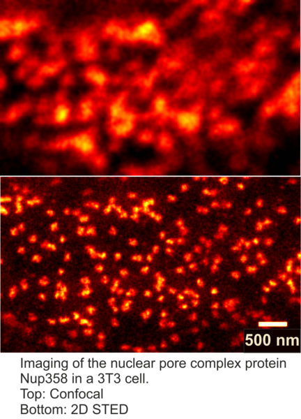 Our STED microscope is a STEDYCON of Abberior Instruments GmbH (http://www.abberior-instruments.com/products/compact-line/). The STEDYCON is an attachment that can be mounted on the camera port of a microscope, turning the microscope into a 2D STED and also a confocal microscope. Its resolution in STED mode is below 40 nm in both x and y direction. Along the z axis the microscope has confocal resolution (~ 500 nm).