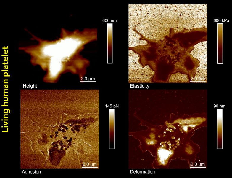 Quantitative nanomechanical mapping of a living platelet. Data channel visualize submembraneous vesicles in an activated platelet. Data were taken using peak-force QNM on a Resolve (Bruker, Santa Barbara /USA).