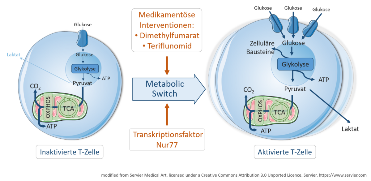 Interessanterweise sind die immunmodulatorischen Effekte einiger zugelassener Medikamente zur Behandlung der MS zumindest teilweise durch ein gezieltes Eingreifen in den Energiestoffwechsel von Immunzellen zu erklären (Klotz et al, Sci Transl Med 2019).