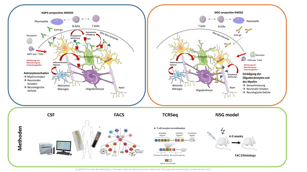 Bei der Neuromyelitis Optica (NMO) handelt es sich um eine seltene Autoimmunerkrankung des zentralen Nervensystems, bei der von B Zellen produzierte Autoantikörper gegen das Wasserkanal-Protein Aquaporin-4 eine große Rolle spielen. Neben der zentralen Bedeutung von B Zellen finden sich jedoch auch Hinweise für eine Rolle fehlregulierter T Zell Antworten als weiteren relevanten Pathomechanismus der Erkrankung. Wir erforschen die Bedeutung dieser fehlregulierten T Zell Antworten bei der NMO in enger Zusammenarbeit mit der Neuromyelitis Optica Studiengruppe (NEMOS) unter Verwendung eines breiten Methodenspektrums einschließlich Durchflußzytometrie des Liquor Cerebrospinalis, immunologischer Charakterisierung der T Zellen im peripheren Blut sowie Analyse des T Zell Rezeptor Repertoires und der transkriptionellen Muster in T Zellen von NMO Patienten. Ein besonderes Interesse haben wir an der vergleichenden Analyse von Patienten mit Aquaporin-4 positiver Neuromyelitis Optika und Patienten mit MOG-Antikörper assoziierten Erkrankungen, einer recht neu definierten verwandten Krankheitsentität.