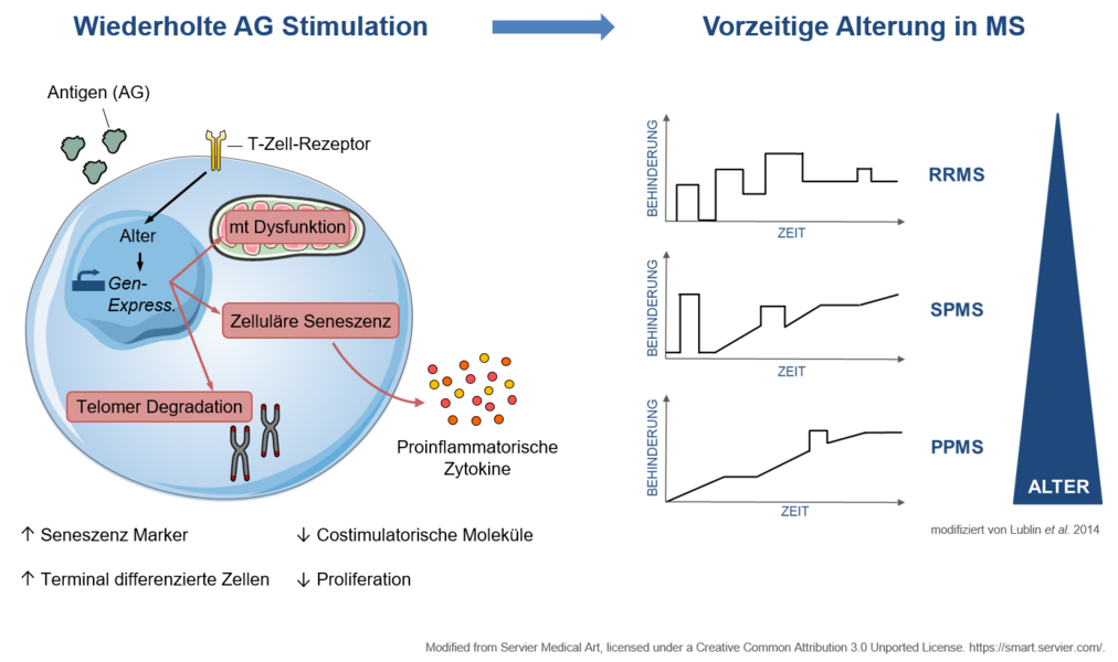 Ein weiterer Schwerpunkt unserer Arbeit liegt in der Charakterisierung der Immunseneszenz, also eines vorzeitigen Alterungsprozesses in Immunzellen mit begleitender Funktionseinschränkung bei entzündlichen Erkrankungen des Nervensystems. Eine vorzeitige Immunalterung, das sogenannte „ImmuneAging“ wurde bereits bei einer Reihe immunologischer Systemerkrankungen wie dem systemischen Lupus erythematodes beschrieben. Bei der Multiplen Sklerose gibt es ebenfalls Hinweise auf vergleichbare Prozesse, dies ist jedoch bisher nicht eingehend charakterisiert. Aus klinischer Perspektive ist dieses Phänomen hochrelevant, da eine rezente Metaanalyse zeigt, dass die Wirksamkeit von Immuntherapien mit zunehmendem Alter der Patienten nachlässt. Dies ist insbesondere vor dem Hintergrund des steigenden Alters unserer Patienten klinisch relevant. Diese Fragestellungen bearbeiten wir mit einem breiten Methodenspektrum aus Vielfarben-Durchflusszytometrie von peripherem Blut und Liquor cerebrospinalis von Patienten zur Charakterisierung des Ausmaßes der Immunalterung, mechanistischen Untersuchungen an humanen Immunzellen zum besseren Verständnis der zugrundeliegenden zellulären Prozesse, sowie tierexperimentellen Studien zur Charakterisierung hieraus abgeleiteter neuer Behandlungsansätze. Die Projekte werden gefördert durch die Deutsche Multiple Sklerose Gesellschaft, Bundesverband e.V. (DMSG) und das Programm "Innovative Medizinische Forschung" (IMF) der Medizinischen Fakultät Münster.