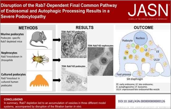An imbalance between endocytosis and autophagy plays a key role in the pathogenesis of kidney diseases. We hypothesize that late endolysosomal transport plays specific roles in podocyte function. To test this, we knocked out the GTPase Rab7 — a key enzyme involved in late endo- and autolysosomal trafficking — specifically in mouse podocytes. These podocyte-specific Rab7 knockout mice develop severe podocyte injury and proteinuria.