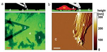 Figure 2: Morphometric quantitation of ECM degradation. a) the nanoscale topography of extracellular matix (ECM, green) as imaged via atomic force microscopy (AFM). A sketch (upper) demonstrates the imaging of a fluorescently labelled ECM (fluorescence image, lower). The degradation of the fluorescently labelled ECM is recognised as dark areas b) AFM-Imaging of a tumor cell on an a degradable extracellular Matrix (original image (lower panel) and schematic representation (upper). The total volume (AFM) of degraded ECM can be exactly calculated by nAnostic-Algorithms. Pictures taken from: Kusick et al. Jornal of Cellular Physiology 204: 767-774 (2005)