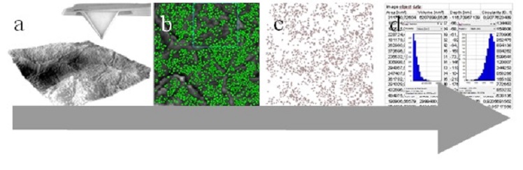 Figure 1: nAnostic-procedure a) the nanoscale topography of the cell sample is recorded via atomic force microscopy (AFM). b) Computer vision segments relevant objects (green) from background, c) Object map for morphometry and d) detailed number values are extracted, here only object count and local volume sum are displayed as histograms. For diagnosis, 10 arbitrarily chosen areas per sample are analysed and morphometrical data are averaged.