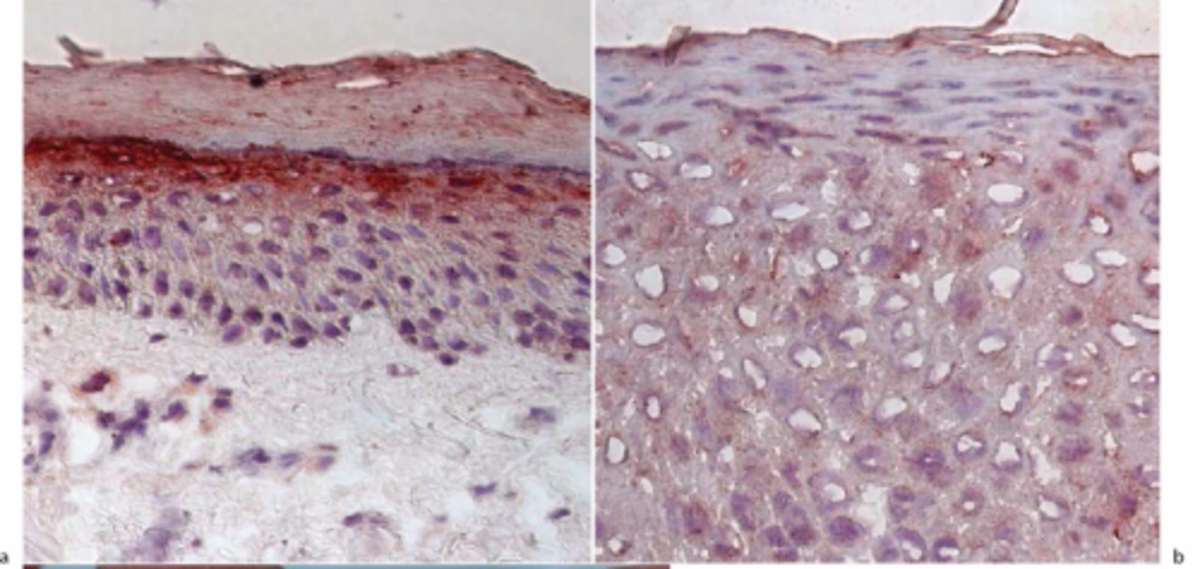 a) positive control individual (normal) staining for LEKTI in the cells of the granular layer;