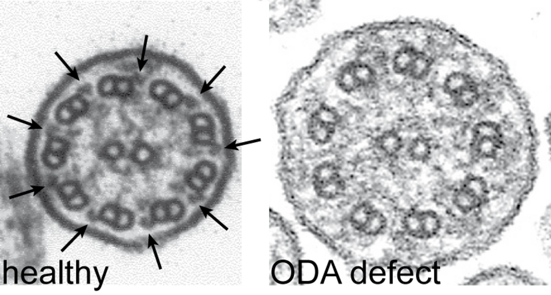 Cilia cross sections from healthy volunteers show nine peripheral pairs of microtubuli with outer (arrows left) and inner dynein arms. PCD patients with mutations in DNAH5 exhibit an ODA defect.