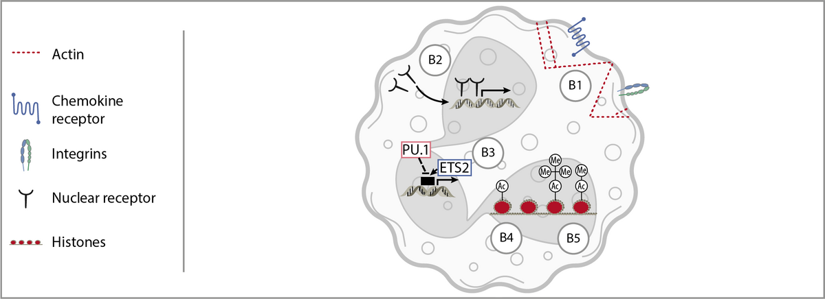 Intracellular processing of receptor signalling towards functional output in terms of gene expression or behaviour is key to the plasticity of immune cells. Project area B unites projects that aim at understanding how intracellular processing of signals regulates neutrophil function. Specifically, the projects cover the rearrangement of the actin cytoskeleton, the importance of nuclear receptors and transcription factors for gene expression, as well as the ability of neutrophils and their progenitors to be trained.
