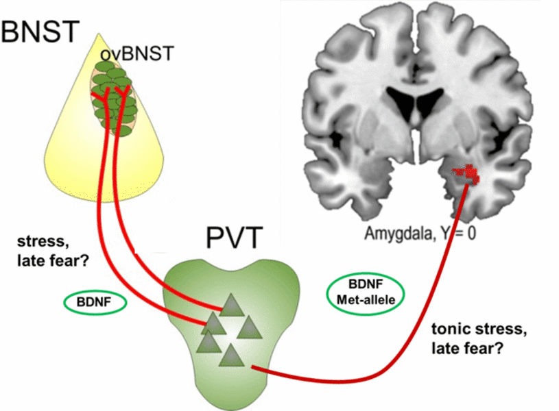 The aim of project B08 is to analyze the role of the BDNF dependent neuronal mechanisms between paraventricular nucleus of the thalamus (PVT), the bed nucleus of the stria terminalis (BNST), and the central amygdala (CeA), causative for stress-dependent long-lasting fear in a combined mouse-human study.