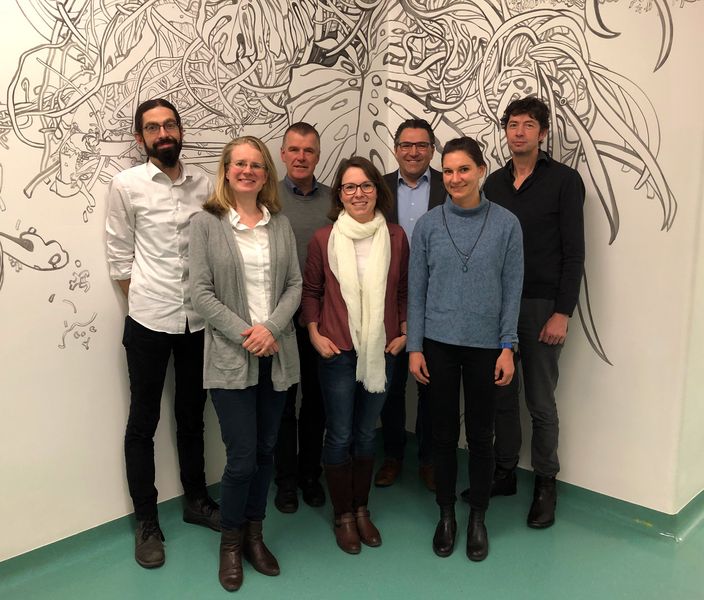 (hintere Reihe von links: Sebastian Sprengel, Martin H. Groschup, Stephan Ludwig, Christian Drosten;