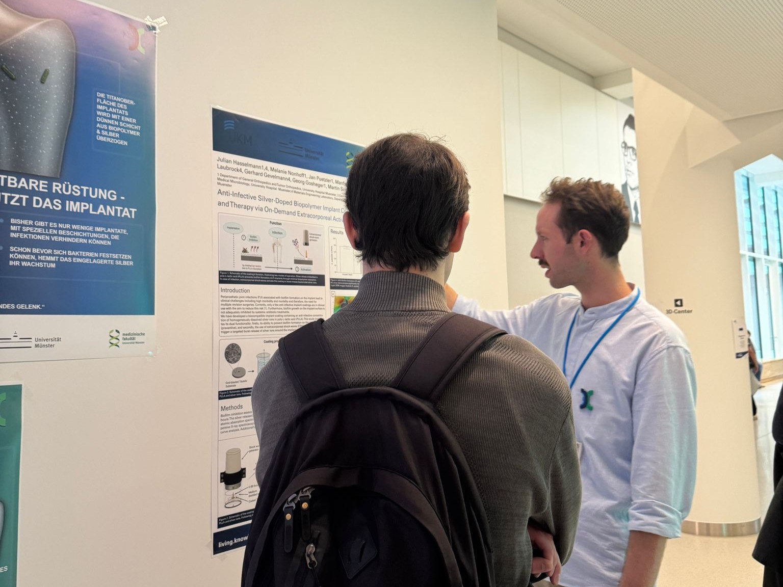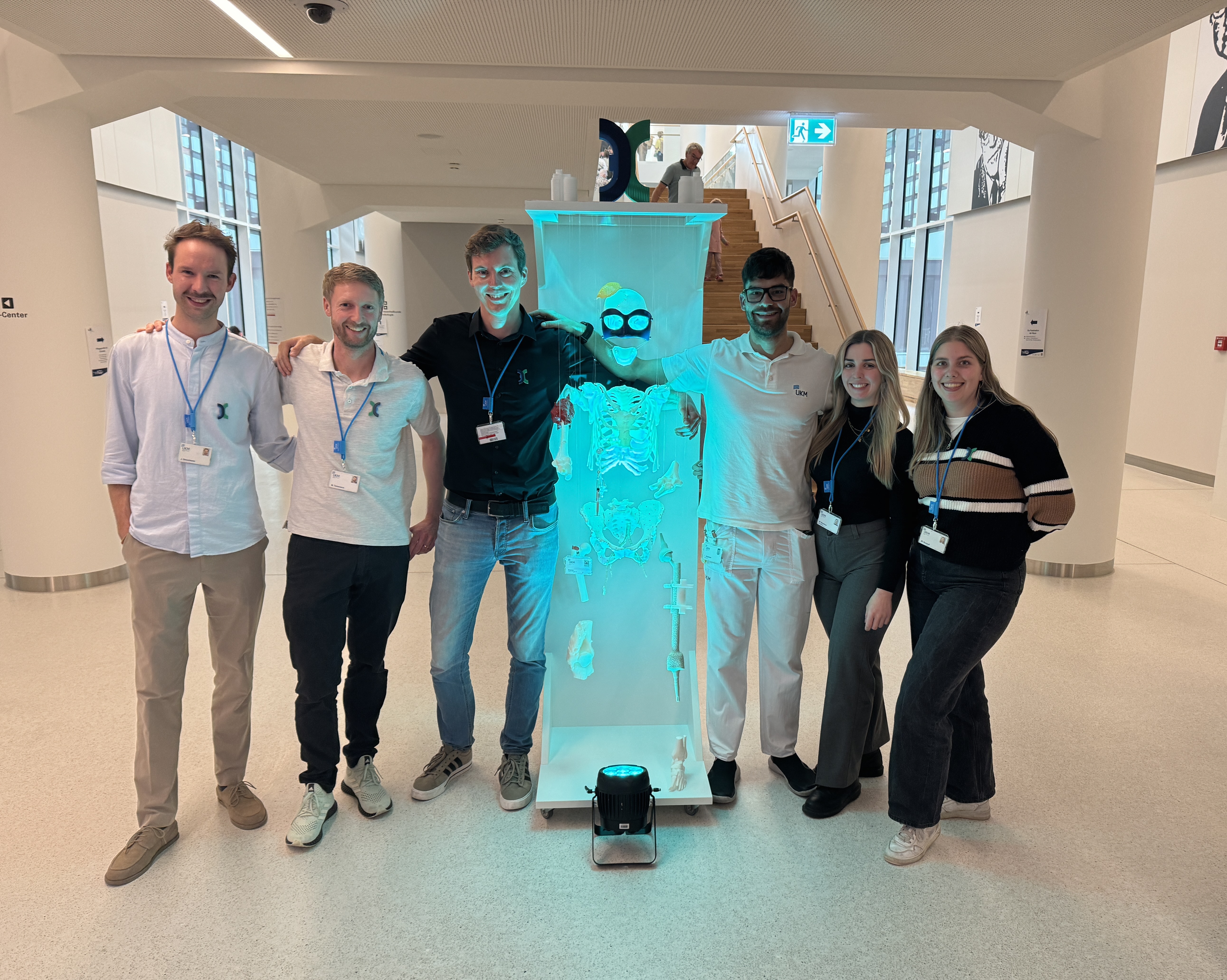 Auch die Experimentelle Orthopädie war mit einem eigenen Beitrag vertreten. Unter dem Motto „Vom digitalen Modell zum echten Implantat – 3D-Druck am UKM“ führten wir die Besucherinnen und Besucher in regelmäßigen Touren durch das 3D-Lab. Dort konnten sie erleben, wie aus digitalen Entwürfen patientenindividuelle Modelle, Hilfsmittel und Implantate entstehen, die direkt im OP eingesetzt werden. Ergänzt wurde das Programm durch spannende Einblicke in unsere Forschungsarbeiten zu antiinfektiven Implantatbeschichtungen.