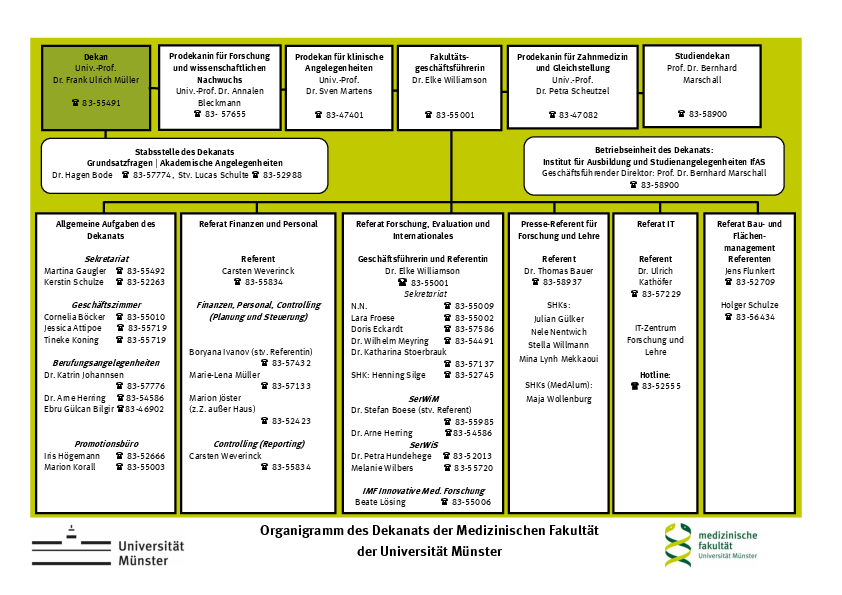 Ein Dekanat ist die zentrale Leitungs- und Verwaltungseinheit einer Fakultät, in diesem Fall der Medizinischen Fakultät der Universität Münster (der zugleich deren Fachbereich 5 ist). Es ist verantwortlich für die strukturelle Weiterentwicklung der Fakultät und die Berufungen von Professorinnen und Professoren. Es setzt die Beschlüsse der Fakultätsgremien wie beispielsweise dem Fachbereichsrat um ist zuständig für Dinge wie Promotions- und Habilitationsangelegenheiten, Finanzmanagement sowie Personalfragen.