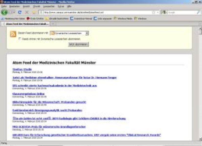 Münster (mfm/tb) - Das ockerfarbene Symbol (Icon) rechts in der Adresszeile Ihres Webbrowsers zeigt es an: Neuigkeiten aus der Medizinischen Fakultät der WWU können Sie auch im Abonnement lesen. Integriert sind neben den Meldungen auf der Startseite auch Neuigkeiten aus Instituten und sonstigen Einrichtungen der Uni-Medizin. Technische Basis des Feeds ist das Atom-Format, das von IT-Fachleuten als Nachfolger von RSS gesehen wird.