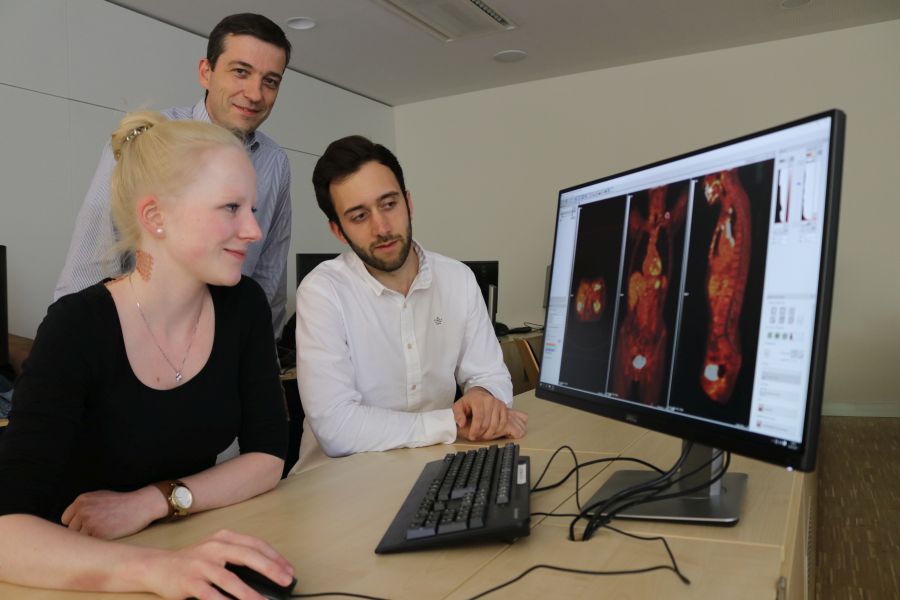 Münster (mfm/js) - So sieht moderne Lehre aus: Anhand von echten Fällen aus der Krankenversorgung am UKM können Studierende der Medizinischen Fakultät seit dem laufenden Sommersemester klinische Fragestellungen mit Hilfe der passenden Bildgebung bearbeiten. Im Projekt „VisualLab“ erhalten die Studierenden im fünften Semester nun einen interaktiven Zugang zur hochmodernen klinischen molekularen, funktionellen und multimodalen Bildgebungen – vergleichbar mit dem aktuellen Standard der nuklearmedizinischen Diagnostik in der münsterschen Unimedizin.Hierfür stehen im Multimediaraum des Lehrgebäudes der Medizinischen Fakultät sieben Bildanalyse-Arbeitsstationen mit der Software OsiriX zur Verfügung. Sie wurde im European Institute for Molecular Imaging (EIMI) unter der Leitung von Prof. Dr. Klaus Schäfers entwickelt. Ursprünglich gedacht für Forschungszwecke wurde schnell deutlich, dass auch Studierende davon profitieren können. „Die Beschäftigung mit molekularer, funktioneller und multimodaler Bildgebung erfordert dabei in einzigartiger Weise kombiniertes Wissen der Physiologie, der Biochemie und der Anatomie sowie der Physik, Chemie und der Computertechnik. Wir möchten mit dem Projekt zu einer breiten und integrierten studentischen Ausbildung beitragen“, macht Prof. Schäfers deutlich. Die Studierenden können mit der Software alle Modalitäten nutzen, die auch in der Klinik vorhanden sind.