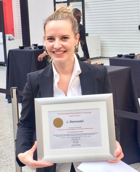 Münster (mfm/sm) - Auszeichnungen im Doppelpack: Dr. Julie Steinestel kann sich über einen weiteren Preis für ihre Forschung zur Wirksamkeit zweier neuer Prostatakrebs-Medikamente freuen. Die Fachärztin an der Uniklinik für Urologie und Kinderurologie in Münster erhielt nun den „Prize for the Best Paper on Clinical Research“ (Preis für die beste Veröffentlichung aus der Klinischen Forschung) der European Association of Urology (EAU). Mitte des vergangenen Jahres war sie für die Präsentation ihrer Ergebnisse, die im Fachmagazin „European Eurology“ erschienen sind, bereits von der NRW-Gesellschaft für Urologie ausgezeichnet worden.Die Forschung der jungen Urologin kommt Patienten mit sogenanntem kastrationsresistentem Prostatakarzinom zu Gute. Bei Betroffenen ist das Krebsleiden so weit fortgeschritten, dass die übliche hormonelle Therapie, die das Tumorwachstum in der Prostata einige Zeit aufhalten kann, nicht mehr wirkt. Speziell für dieses Stadium der häufigsten Krebserkrankung bei Männern in Deutschland wurden jüngst die Medikamente Abiraterone und Enzalutamid auf den Markt gebracht. Jedoch helfen die Arzneien nicht bei Patienten, die eine bestimmte Androgenrezeptorveränderung haben – zumindest dachten die Forscher das bisher. Steinestel konnte nämlich nachweisen, dass Patienten mit der AR-V7 Splicevariante, wie die Rezeptorveränderung in Fachkreisen heißt, sehr wohl von Abiranterone und Enzulutamid profitieren können und ihnen deshalb eine Therapie nicht verwehrt bleiben sollte.Die Auszeichnung der EAU ist in Fachkreisen sehr hoch angesehen und deshalb von besonderer Bedeutung – gerade für die junge Nachwuchswissenschaftlerin. Der Preis ist mit 5.000 Euro dotiert.