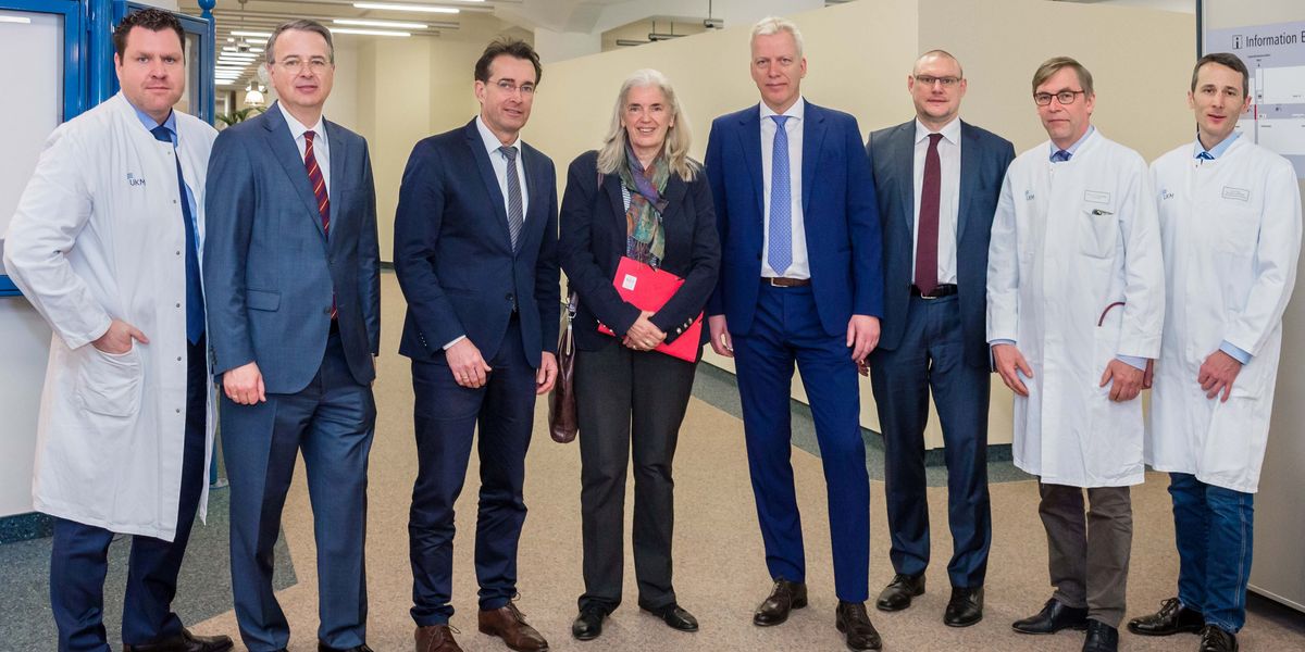 Münster - NRW-Kultur- und Wissenschaftsministerin Isabel Pfeiffer-Poensgen war am Freitag (20.04.) am Universitätsklinikum Münster (UKM) zu Gast, um sich einen Überblick über den Medizin- und Forschungsstandort Münster zu verschaffen. Bei einem Rundgang war die Krankenversorgung, im Speziellen die Besonderheit der Universitätsmedizin, ebenso Thema wie die Bedeutung der Forschung und der daraus resultierende Mehrwert für den Patienten am Beispiel der Krebsmedizin. Dritter Schwerpunkt des mehr als zweistündigen Besuchs war der „Pakt für das UKM“, der alle aus Sicht der münsterschen Universitätsmedizin notwendigen infrastrukturellen Maßnahmen auf dem Campus bis zum Jahr 2027 umfasst. Rede und Antwort standen der Ministerin neben dem Vorstand des UKM um Prof. Robert Nitsch, Dr. Christoph Hoppenheit und Pflegedirektor Thomas van den Hooven auch der Prodekan der Medizinischen Fakultät, Prof. Sven Meuth, sowie der Aufsichtsratsvorsitzende Prof. Martin Schulze Schwienhorst sowie Mitarbeiter aus den Bereichen Krankenversorgung und Forschung.
