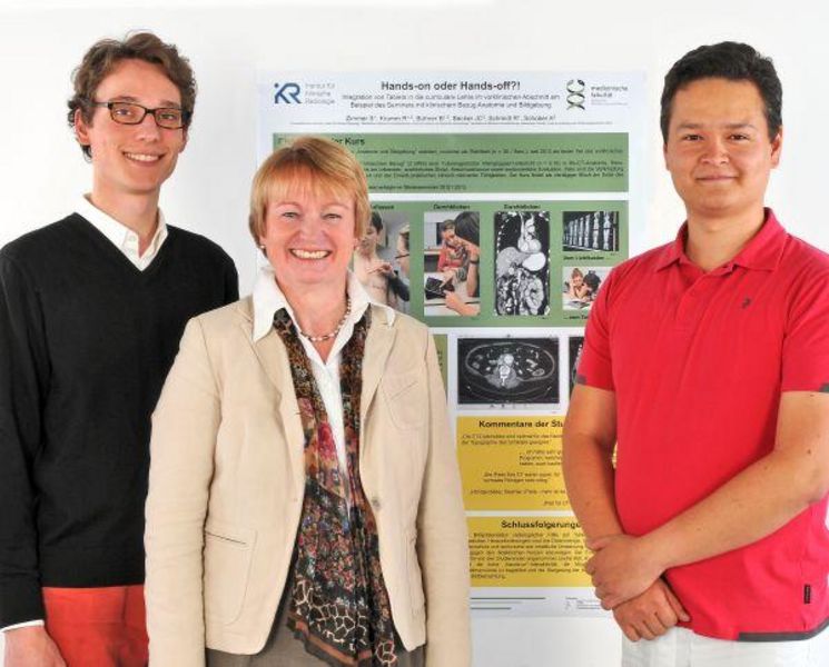 Münster (mfm/hms) - Um ein Computertomogramm (CT) richtig interpretieren zu können, brauchen Ärzte eine Menge Erfahrung. Die Medizinstudierenden der Uni Münster erlernen deshalb schon ab dem dritten Semester die Grundzüge im Umgang mit CT und Röntgenbildern – in kleinen Gruppen und mithilfe von Tablet-Computern. Für eine Präsentation dieses Lehrkonzeptes wurde die interdisziplinäre Arbeitsgruppe „Anatomie und Bildgebung“ um Dr. Anna Schober nun mit dem Posterpreis für die beste Visualisierung ausgezeichnet.