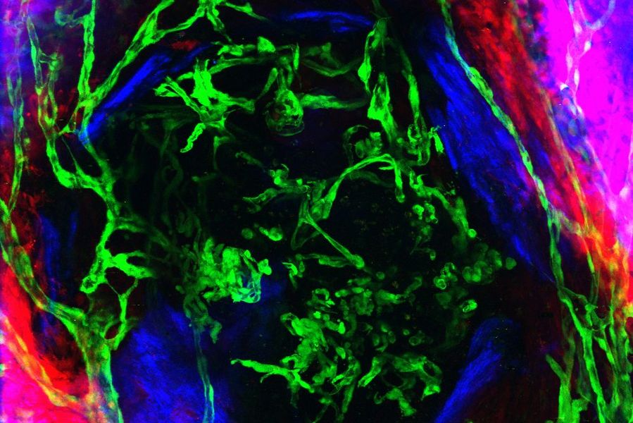Um das Wachstum neuer Blutgefäße und die Heilung des Knochengewebes im Schädel live beobachten zu können, hat ein Max-Planck-Forscherteam eine spezielle Mikroskopie-Methode entwickelt. Mit dem Multiphotonenmikroskop, das auf intravitale Untersuchungen spezialisiert ist, konnten die Wissenschaftlerinnen und Wissenschaftler in tiefe Gewebeschichten vordringen und dort Gefäß- und Knochenzellen sowie Faserstrukturen des Knochenkollagens mit hoher Auflösung sichtbar machen.