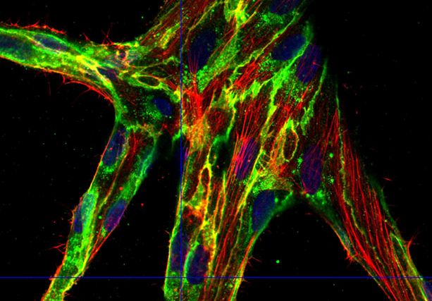 Die Arbeitsgruppe um Biochemikerin Prof. Dr. Lydia Sorokin ist auf die Untersuchung der Laminine spezialisiert, die Gruppe von Biochemiker Prof. Dr. Dietmar Vestweber beschäftigt sich schon lange mit dem Molekül VE-Cadherin. Anästhesist Prof. Dr. Alexander Zarbock brachte eine spezielle Methode ein, die Intravital-Mikroskopie. „Damit konnten wir die Blutgefäße und wandernden Immunzellen im sehr dünnen Muskel sichtbar machen und die schwer zu visualisierende Basalmembran anschauen. Wir haben dazu spezielle Antikörper aus unserem Labor genutzt, mit denen wir Laminin 511 aufspüren können“, erklärt Lydia Sorokin. In Mäusen, deren Immunzellen mit dem „Grün fluoreszierenden Protein“ (GFP) genetisch markiert waren, beobachteten die Forscher, an welchen Stellen die Immunzellen die Barrieren vermehrt durchwanderten. Die Basalmembran wurde mit einem rot fluoreszierenden Antikörper markiert, die Endothelzellschicht mit einem blau fluoreszierenden Signal. Wenn der fluoreszierende Stoff zu lange belichtet wird, bleicht er allerdings aus. Die Aufgabe von Mathematiker Prof. Dr. Benedikt Wirth war es daher, zu rekonstruieren, wo sich die rot und grün fluoreszierenden Signale ursprünglich angesiedelt hatten. Darüber hinaus brachte Neurologe Prof. Dr. Heinz Wiendl eine Methode ein, um den Widerstand der Endothelzellschicht zu messen, bevor und während die Immunzellen durch diese Barriere wandern.