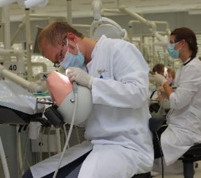 „Für unsere Studenten ist die Arbeit am Phantom die letzte Probe, bevor sie echte Patienten behandeln dürfen“, sagt Oberarzt Dr. Markus Kaup von der Poliklinik für Zahnerhaltung. Bevor die Studierenden – in ihrem sechsten Semester - bohren und füllen, „basteln“ sie ihr eigenes Phantom – gearbeitet wird in der zweiten Semesterhälfte mit echten Zähnen, die in vorgefertigte Hohlformen gesetzt werden. „Ein echter Zahn ist das beste Übungsobjekt, das es geben kann“, erläutert Kaup. Ihr „Lehrmaterial“ besorgen sich die Studierenden selbst, indem sie bei Zahnarztpraxen an ihren Heimorten danach fragen. „Schon seit Generationen werden in der zahnmedizinischen Ausbildung Zähne genutzt, die sich bei den Patienten nicht erhalten ließen“, so Kaup.
