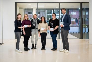 Prof. Tanja Kuhlmann (3. v. l.), Vorsitzende der IMF-Kommission, zusammen mit den diesjährigen PreisträgerInnen: Dr. Linda M. Bonnekoh, Dr. Susanne L. Meinert, Dr. Claudia Tulotta, Dr. Joanna Sherwood und Dr. Andrew F. Berdel (Foto: Uni MS / E. Wibberg)