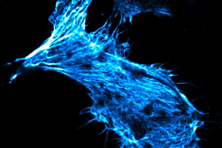 Mikroskopieaufnahme einer lebenden menschlichen Krebszelle in Zellkultur, deren Zellskelett mit fluoreszenzmarkiertem Phalloidin eingefärbt ist. Wissenschaftler schleusten diese giftige Substanz mit neu entwickelten Nanocontainern in die Zelle ein und wiesen so nach, dass die Container Stoffe, für die die Zellmembran normalerweise undurchlässig ist, in die Zelle transportieren und dort freisetzen können (Abb.: Kudruk and Pottanam Chali et al./Adv Sci 2021)