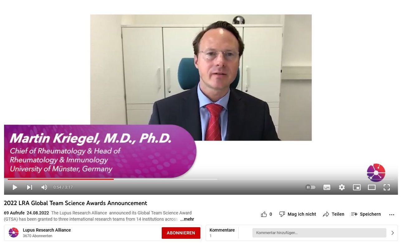 "Unsere früheren Arbeiten am Tiermodell haben gezeigt, dass Mikroben, die im Verdauungstrakt leben, den Darm verlassen und dadurch das Immunsystem zur Schädigung von Organen bringen können. Jetzt übertragen wir unsere Forschung auf den SLE beim Menschen“, so der Rheuma-Experte. Letztlich gehe es darum, „eine neue Reihe von personalisierten Diagnosen und Behandlungen für Lupus zu entwickeln, die auf die 'schlechten' Darmbakterien abzielen". Das münstersche Team wird die Förderung in erster Linie für die Identifizierung der Lupus-verursachenden Darmmikroben nutzen. Die beiden anderen Teams legen den Fokus auf die Bereiche Genetik (Prof. Eric Morand, Australien) und Zellkunde (Dr. Betty Diamond, USA). Insgesamt erhält das Trio über den „Global Team Science Award“ (GTSA) der Lupus Research Alliance neun Millionen Dollar. Die beteiligten Forscherinnen und Forscher stammen aus 14 Institutionen und verteilen sich auf vier Kontinente. Jedes der drei multidisziplinären Forschungsteams erhält über einen Zeitraum von drei Jahren drei Millionen Dollar. Mit ihrem GTSA unterstützt die LRA Projekte, die aufwändige Technologien einsetzen müssen, um wirksame, personalisierte Lupusbehandlungen entwickeln zu können.