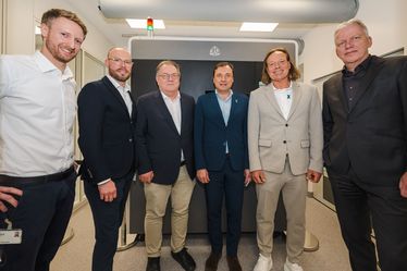 Nur mit dem Weitwinkel einzufangen: Der Spitzen der münsterschen Universitätsmedizin und die Betreuer des neuen 3D-Centers vor dessen Herzstück, einem 1,4 t schweren Großgerät (v.l.n.r.: Dipl.-Des. Max Tönnemann, PD Dr. Dr. Martin Schulze, Dekan Prof. Frank Ulrich Müller, Ärztl. Direktor Prof. Alex W. Friedrich, Klinikdirektor Prof. Georg Gosheger, Kaufm. Direktor Dr. Christoph Hoppenheit) (Foto: Uni MS/M. Heine)