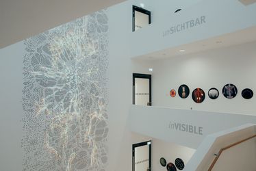 Die zwölf Meter hohe Wandinstallation „Auf | Lösung“ der Künstlerin und Professorin für Wissenschaftsillustration Cordula Hesselbarth löst den menschlichen Organismus visuell in seine Bausteine auf. Punkte in unterschiedlichen Größen dienen als abstrakte Symbole für Zellen, Moleküle oder Atome. Im Spiel aus Licht und Schatten, Entfernung und Nähe und zeitweise mit bewegten Lichtprojektionen nähert sich das Werk künstlerisch der Forschung im MIC – der biomedizinischen Bildgebung von Zellen in Bewegung.