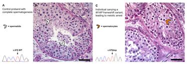 Münster (upm/mfm) - Störung bei der Spermienbildung: Männliche Unfruchtbarkeit beschäftigt nicht nur die Betroffenen, sondern auch das Team um Prof. Frank Tüttelmann. Mit einer Vielzahl unterschiedlicher Projekte versucht die Arbeitsgruppe (AG) Reproduktionsgenetik der Medizinischen Fakultät der Westfälischen Wilhelms-Universität Münster (WWU) weiteren Ursachen für männliche Unfruchtbarkeit (Infertilität) auf den Grund zu gehen. Die jüngste Erkenntnis: Die Identifizierung eines neuen Gens namens M1AP, das als relevante Ursache für männliche Zeugungsunfähigkeit angesehen wird. Die Ergebnisse dieser Forschung, die unter der Leitung von Frank Tüttelmann, Corinna Friedrich und Margot Wyrwoll entstanden sind, wurden jetzt in der Fachzeitschrift „American Journal of Human Genetics“ veröffentlicht - sie stellen einen wichtigen Fortschritt in der Aufklärung männlicher Infertilität dar.
