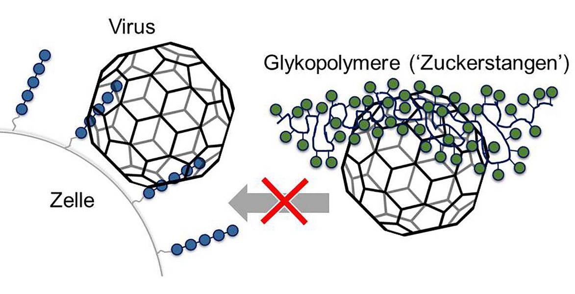 Wenn ein Virus sich erst auf der Zelloberfläche festgesetzt hat, kann es sein Erbgut in die Zelle einschleusen und diese für seine Zwecke umfunktionieren. Viele antivirale Mittel verlieren allerdings im Laufe der Zeit ihre Wirkung, da Viren sehr schnell mutieren und sich so oft an die Abwehr anpassen können. Ein Forschungsteam um die HHU-Professorin Laura Hartmann vom Lehrstuhl Makromolekulare Chemie und den münsterschen Professor Mario Schelhaas vom Institut für Zelluläre Virologie verfolgten in Zusammenarbeit mit Prof. Nicole Snyder vom Davidson College in North Carolina / USA den Ansatz, den ersten Kontakt des Virus mit der Zelle zu unterbinden, so dass die Infektionskette nicht starten kann.